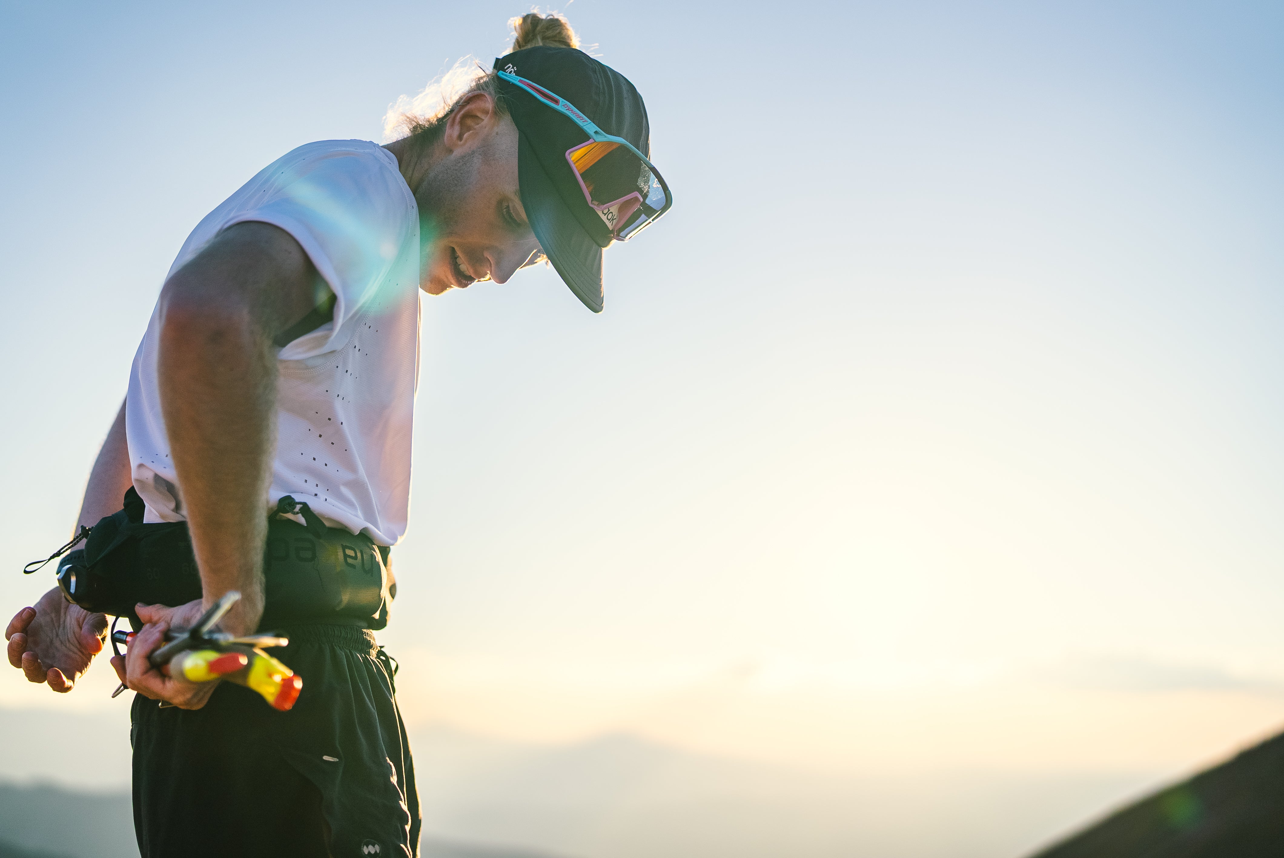 Naked athlete Ryan Becker going high and long in the mountains with his HC Band